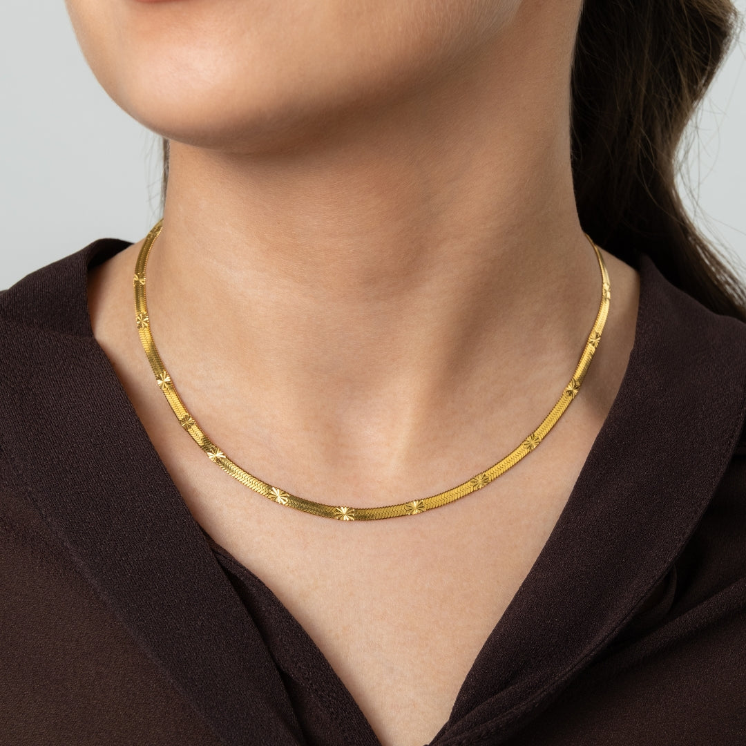 Capture a "Golden Hour" e leve-a consigo para todo o lado com a Corrente Plana Solar. Esta peça distingue-se das correntes planas tradicionais pela sua superfície texturada com pequenas gravações em forma de raios de sol (ou estrelas). Este detalhe não é apenas estético; ele multiplica o brilho da peça, fazendo com que a corrente cintile intensamente a cada movimento, criando um efeito de "ouro líquido" sobre a pele.
