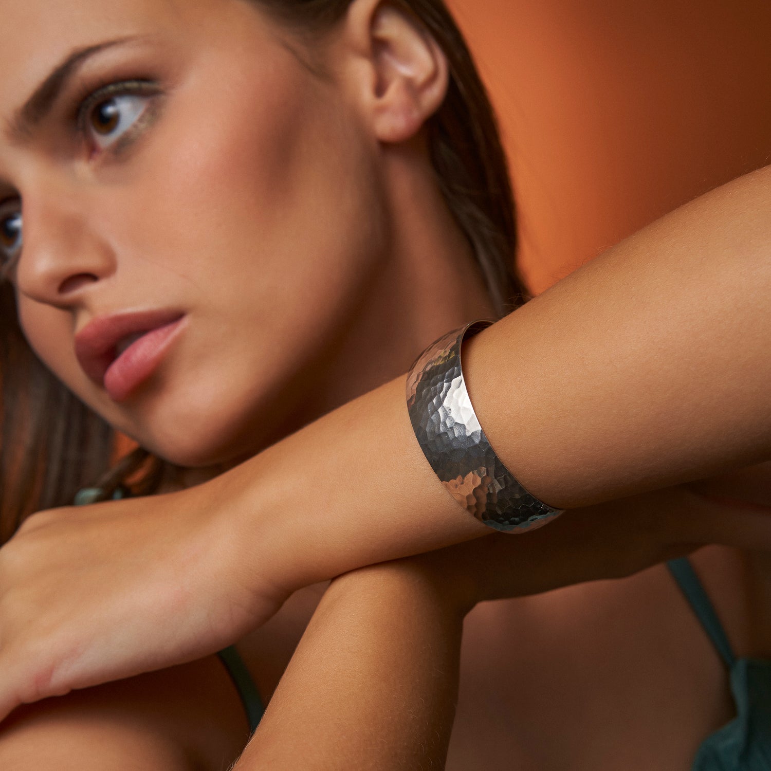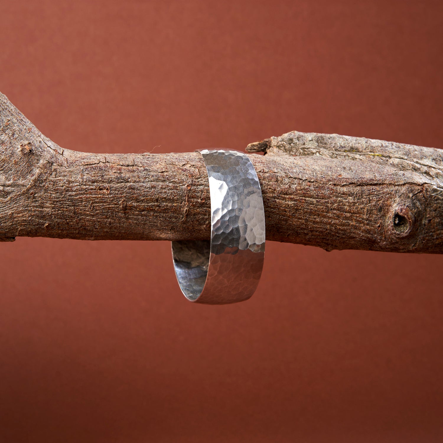 Pulseira rígida aberta com efeito martelado.